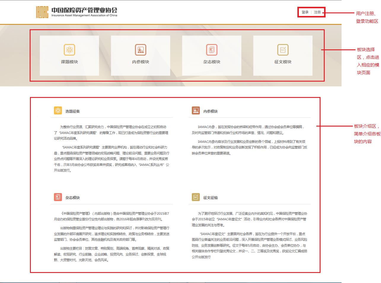 1. 登錄“中國(guó)保險(xiǎn)資產(chǎn)管理業(yè)協(xié)會(huì)征稿系統(tǒng)”首頁(yè)(http://zg.iamac.org.cn),點(diǎn)擊“注冊(cè)”并完成用戶注冊(cè)流程。隨后登錄轉(zhuǎn)入首頁(yè),選擇相應(yīng)模塊進(jìn)入(目前僅征文模塊面向注冊(cè)用戶開放使用)。