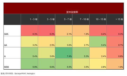 我們看到監(jiān)管主導(dǎo)的資產(chǎn)配置下,各機構(gòu)希望能夠獲得越來越多的匹配調(diào)整,特別是對于傳統(tǒng)型、保障型的保險公司,實際上不需要把太多的資金配置到其他類資產(chǎn)上。即便只專注于信用債領(lǐng)域,做好優(yōu)化,也能做得很好。舉例來說,如果我們把信用債拆開來看其償付能力,可以看到,根據(jù)不同的評級,不同的久期,會有不同的監(jiān)管最低資本要求。即將所需資本金作為分母,信用風(fēng)險溢價作為分子,我們就可以做出資本回報率的公式。