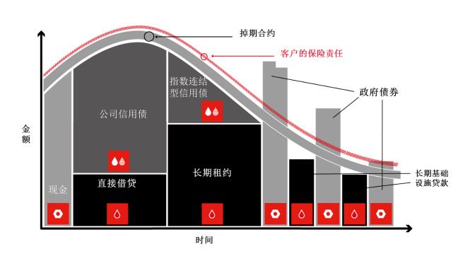 我們可以根據(jù)久期與風(fēng)險評級就可以算出每一類別信用債的資本回報率。圖中可以看出,特定的市場環(huán)境下,細分信用債類別之后,可以找到資本回報率更高的信用資產(chǎn)類別。但是在實務(wù)中,并不是單單配置高資本回報率的信用資產(chǎn)這么簡單。我們剛才提到,為了獲得匹配調(diào)整,保險公司需要把資產(chǎn)負債現(xiàn)金流高度匹配。