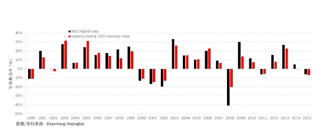 簡單總結(jié)一下這類投資方案的回報率,下面這張圖是回溯分析,假設(shè)我們按照剛才的公式組建投資組合,紅色的支柱代表的是歷年波幅控制型的股權(quán)投資回報率,黑色的支柱是MSCI全球股指回報??梢钥闯?,波幅控制型的投資組合在回報表現(xiàn)上非常穩(wěn)定,特別是在經(jīng)濟危機時期,該策略會有更好的相對表現(xiàn)。