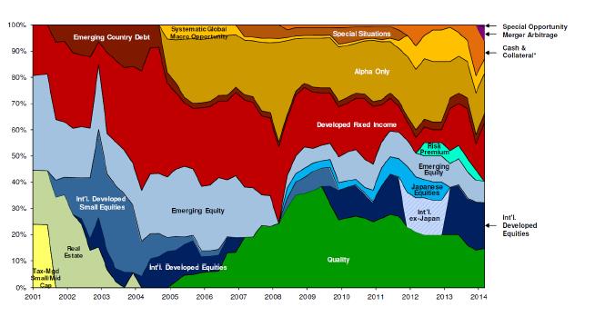 較前面介紹的波幅控制型股權(quán)投資。通過動態(tài)調(diào)倉進行風(fēng)險控制,它有一個弊端,即波動率非常大的時候,資產(chǎn)組合中有大量現(xiàn)金,這并不一定是非常有效的方式,因為現(xiàn)金不產(chǎn)生足夠的回報。其實在經(jīng)濟周期里,不同的資產(chǎn)類別說到底對經(jīng)濟周期的反應(yīng)不一樣,有些就是逆周期投資,如果能在更豐富的資產(chǎn)大類里面做動態(tài)的調(diào)整,這時候可以做到不用持有大量現(xiàn)金也可以達到動態(tài)調(diào)倉的效果。由于時間關(guān)系,我們不能對這種投資策略進行詳細的介紹。下圖顯示的是某個風(fēng)險分散式成長型基金歷年資產(chǎn)配置的變化。